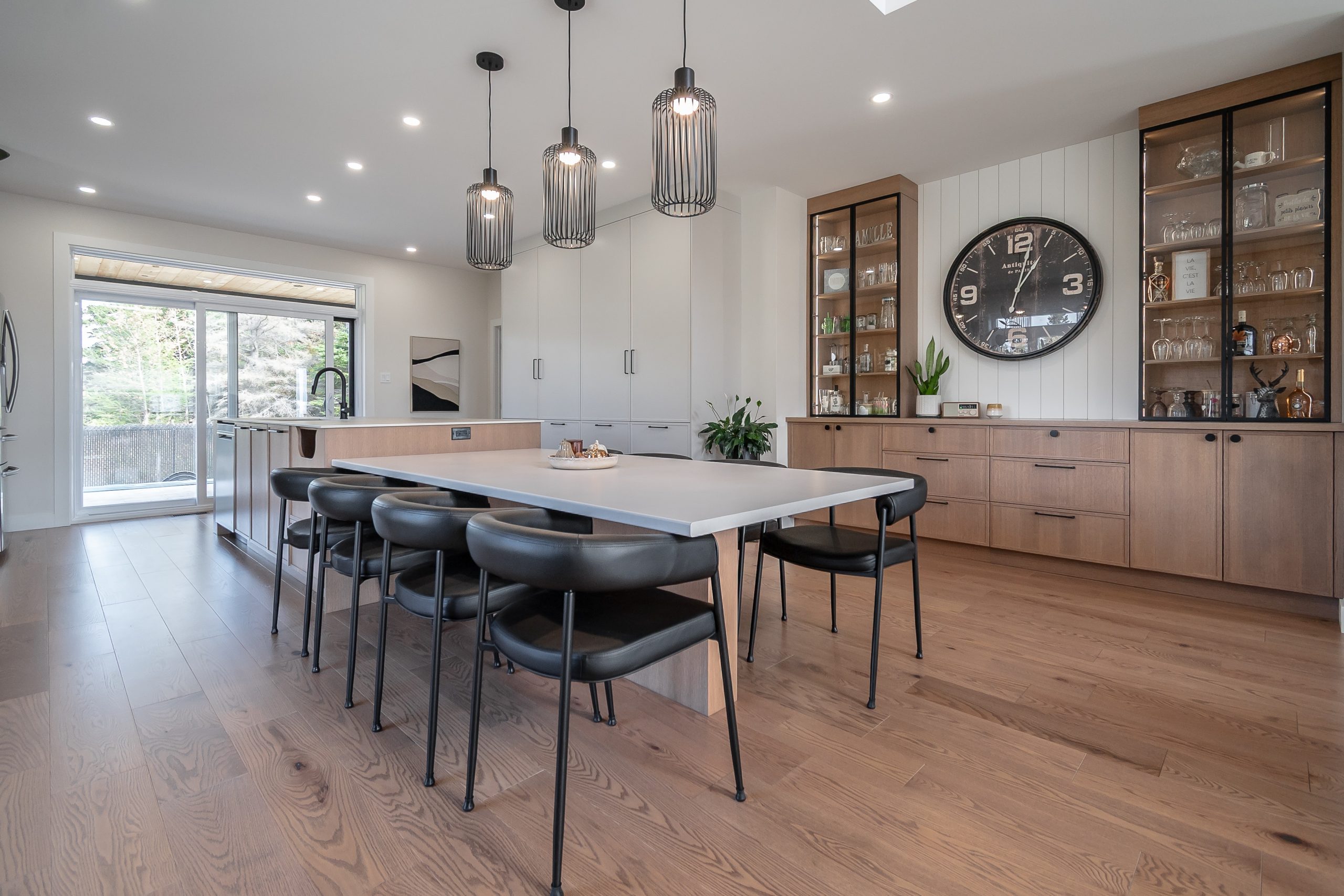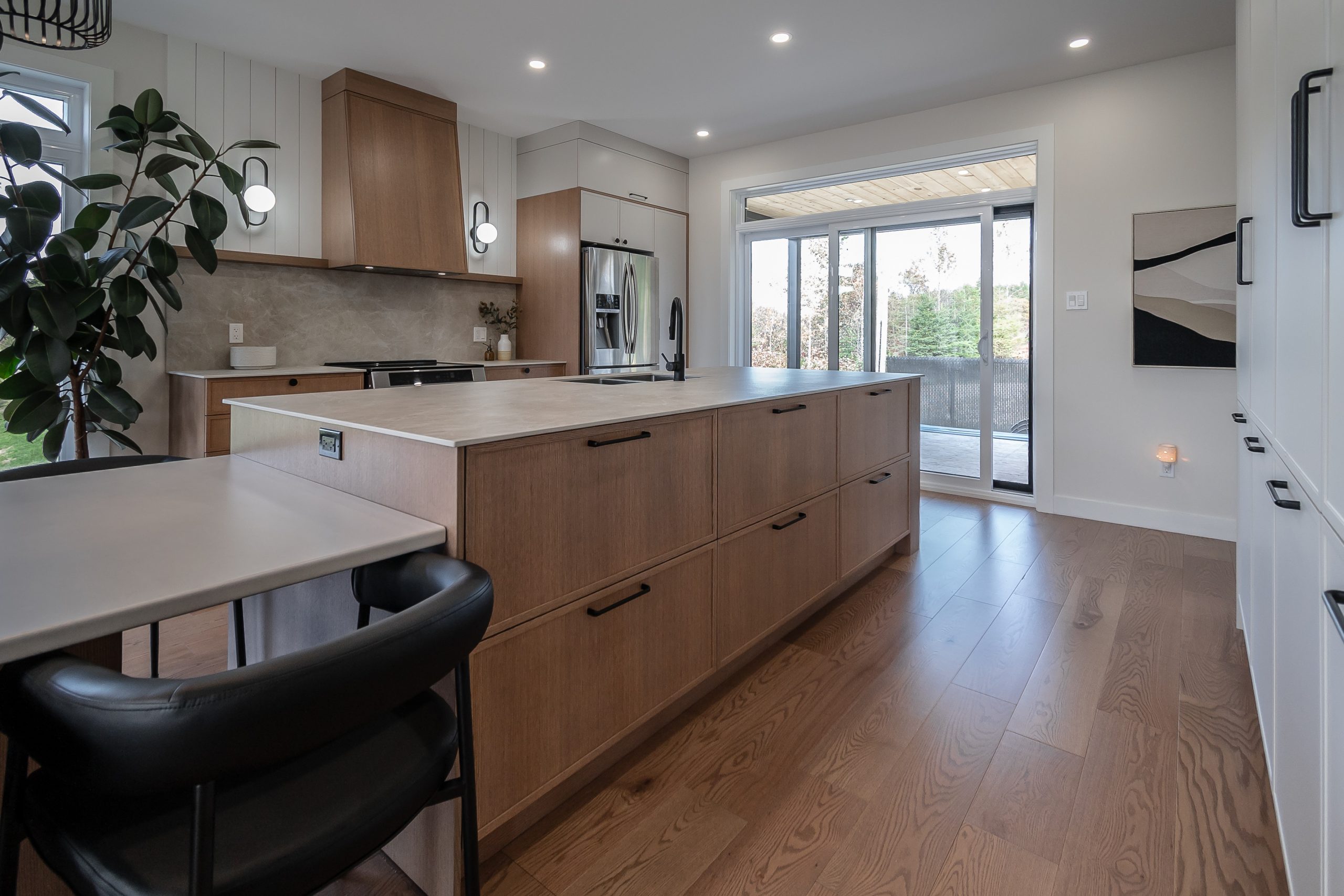 Véritable pièce maîtresse de la cuisine, l’îlot impressionne par ses dimensions généreuses et son côté pratique. Les larges tiroirs offrent un rangement optimisé, parfait pour tout garder à portée de main. Dans son prolongement, une table intégrée crée un coin-repas pratique. À proximité, la zone de cuisson attire l’attention grâce à sa hotte encastrée dans un caisson faisant écho aux armoires boisées, pour une finition cohérente et raffinée.