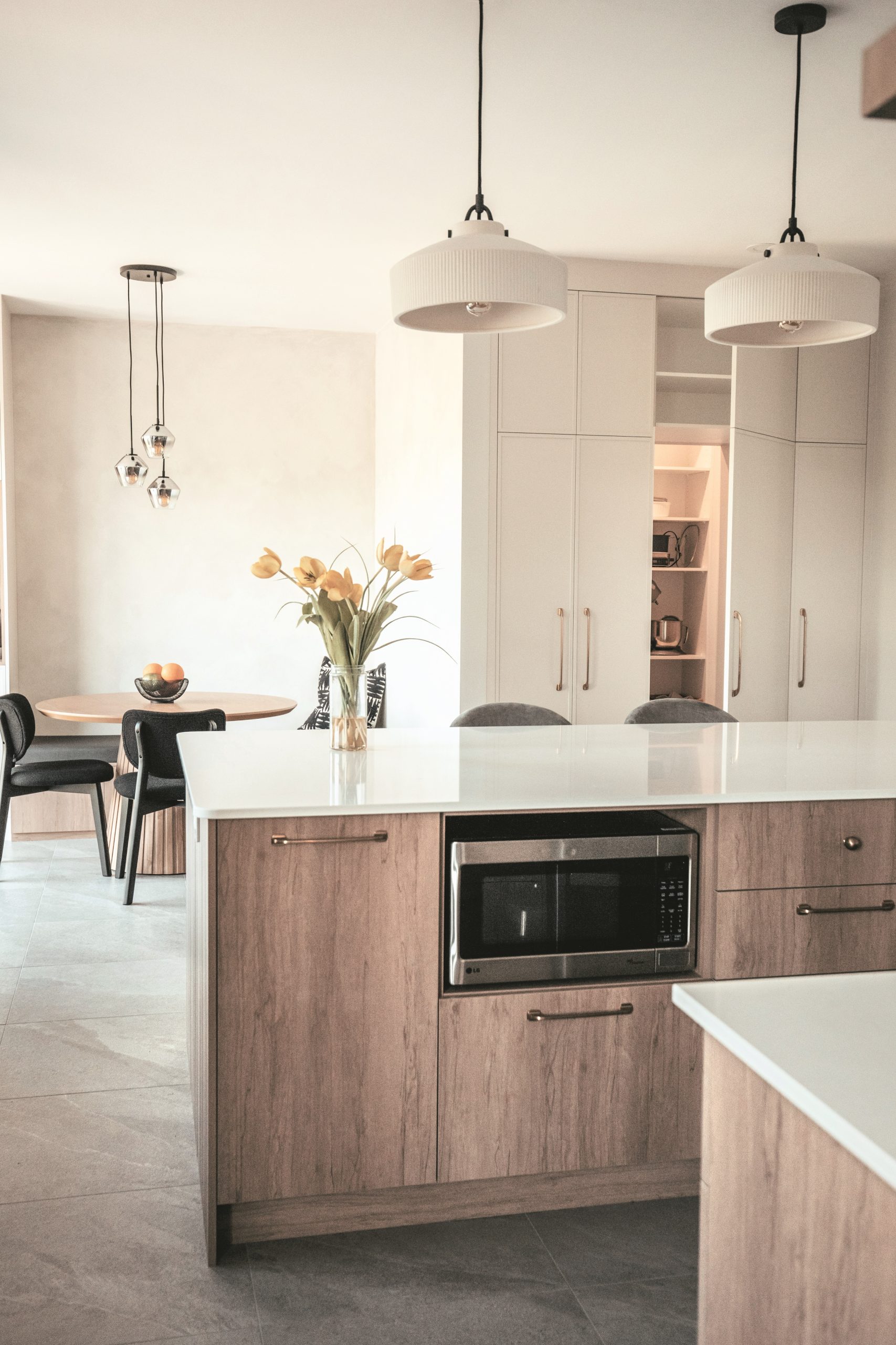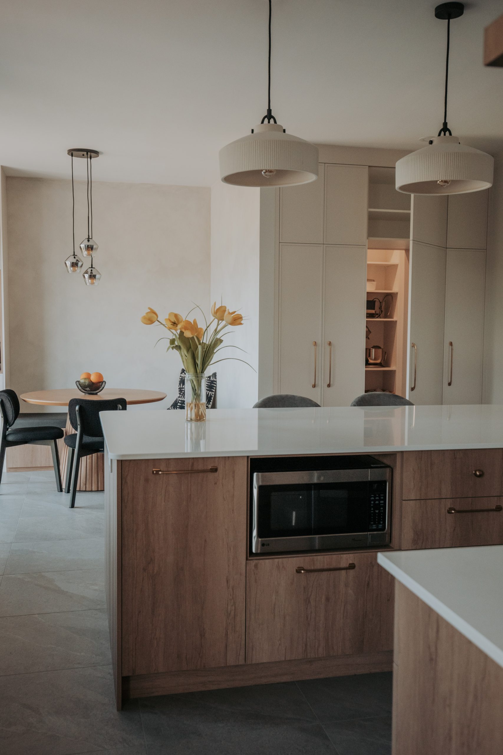 Pensée pour une famille, cette cuisine allie chaleur à simplicité dans un esprit moderne chaleureux. L’aménagement ouvert, les armoires en mélamine beige clair et effet bois, les comptoirs en quartz et les tablettes décoratives contribuent à créer une pièce accueillante et lumineuse. Une attention particulière a été portée à l’espace repas et au rangement, avec notamment une banquette sur mesure et un garde-manger walk-in.
