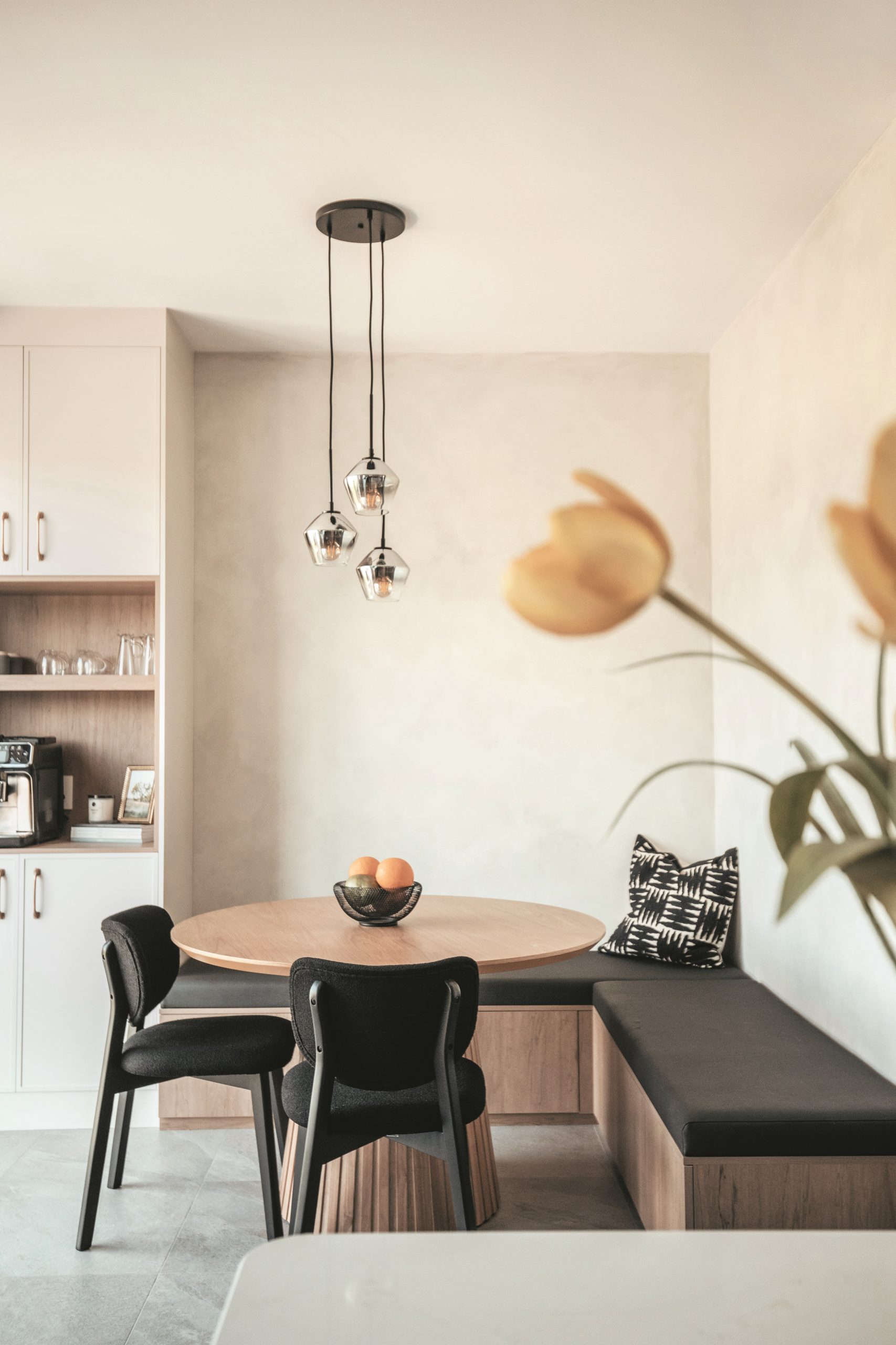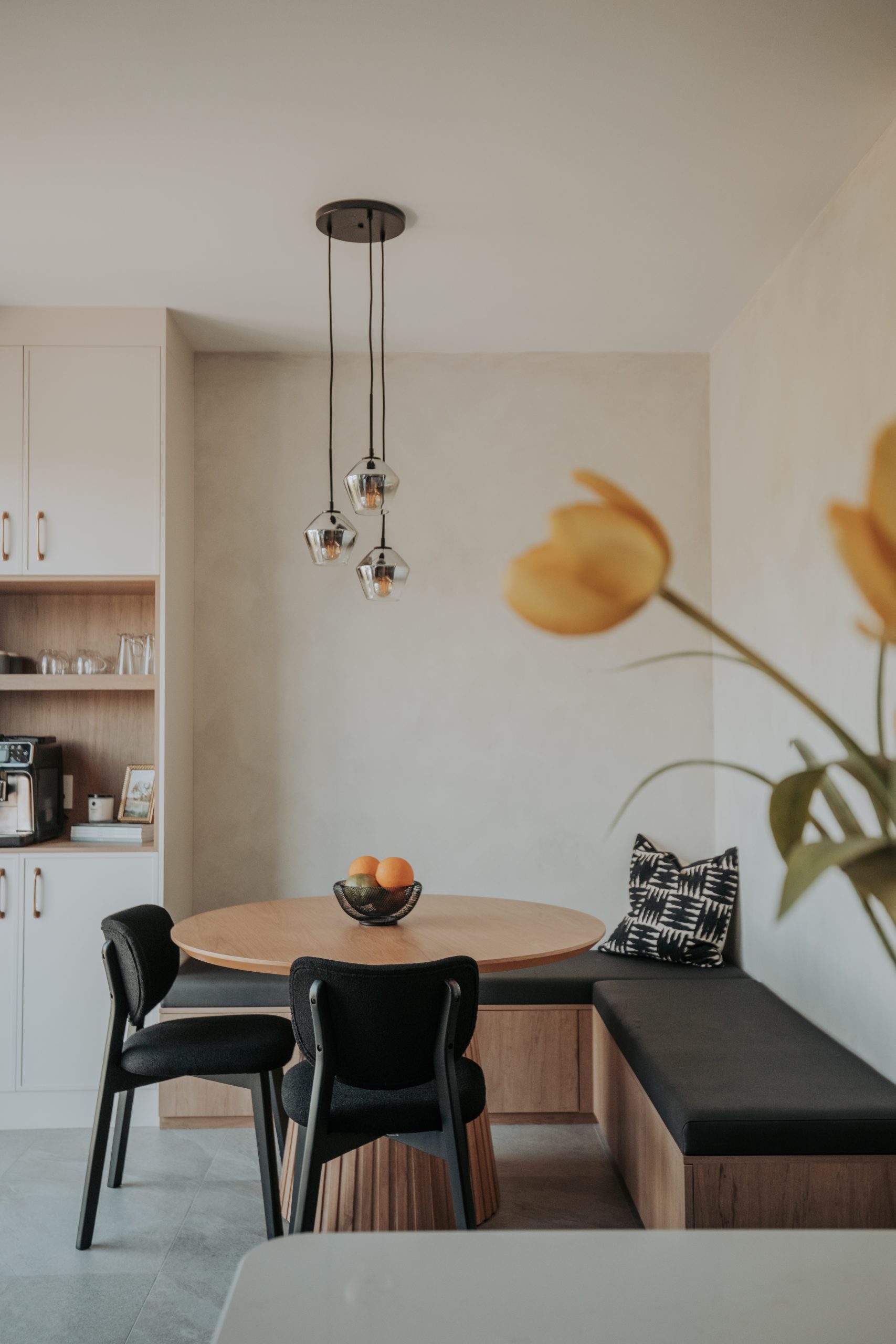 Le coin-repas sur mesure, avec sa banquette en vinyle et sa table ronde en bois, offre un espace confortable et décontracté pour les repas. L’enduit à la chaux sur les murs, faisant écho à la hotte, enveloppe la pièce d’une atmosphère douce et chaleureuse. À gauche, un coin café intégré complète l’aménagement avec une touche pratique et conviviale.