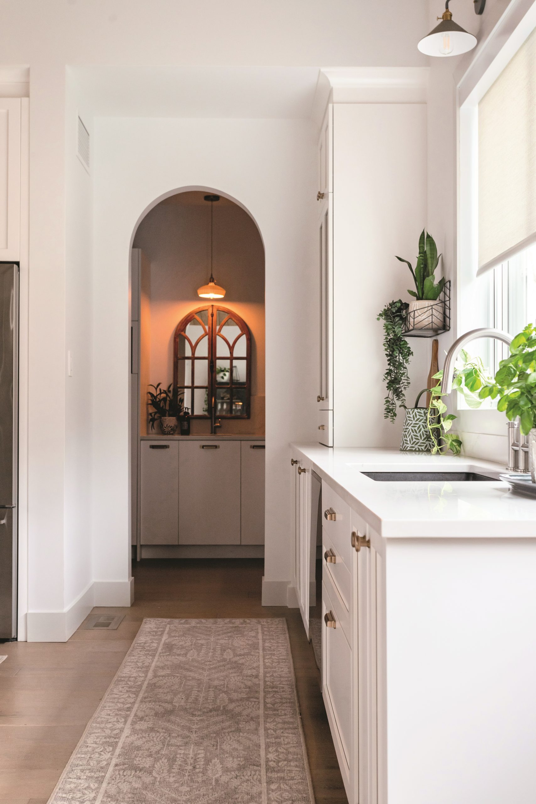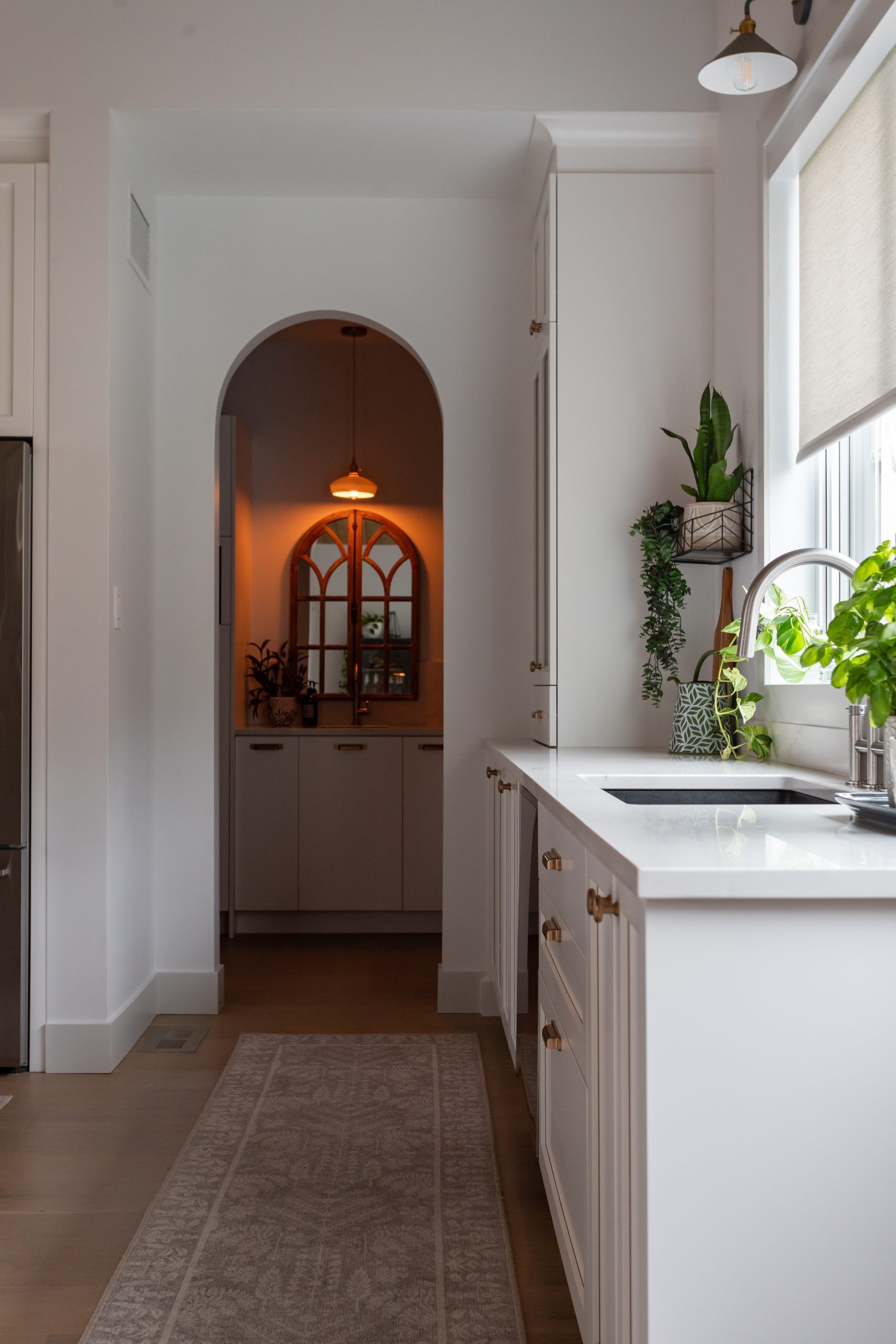 L’arche dévoile le garde-manger walk-in harmonieusement intégré à la cuisine. Placé devant une grande fenêtre, l’évier bénéficie d’une abondante lumière naturelle qui adoucit les corvées de vaisselle.