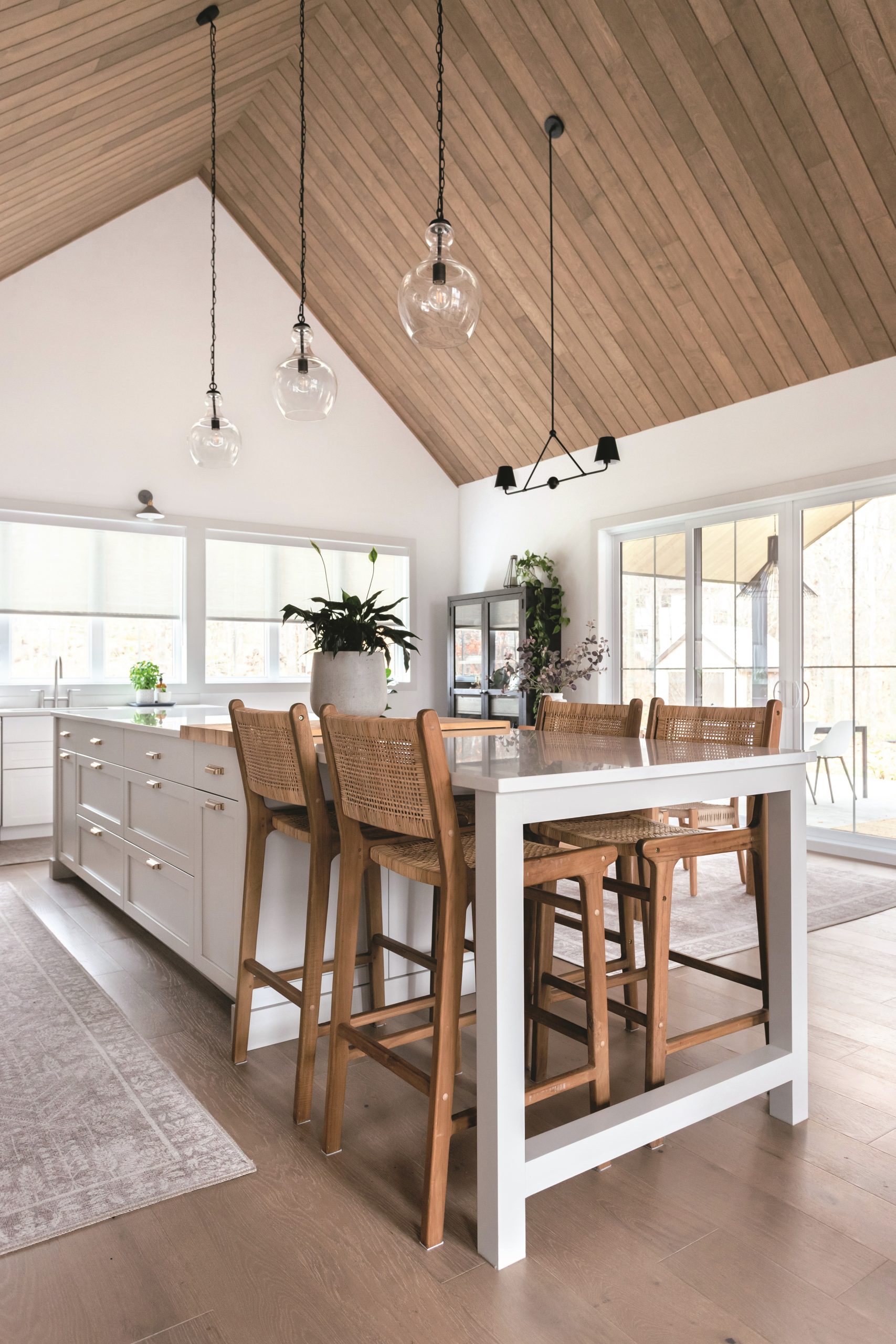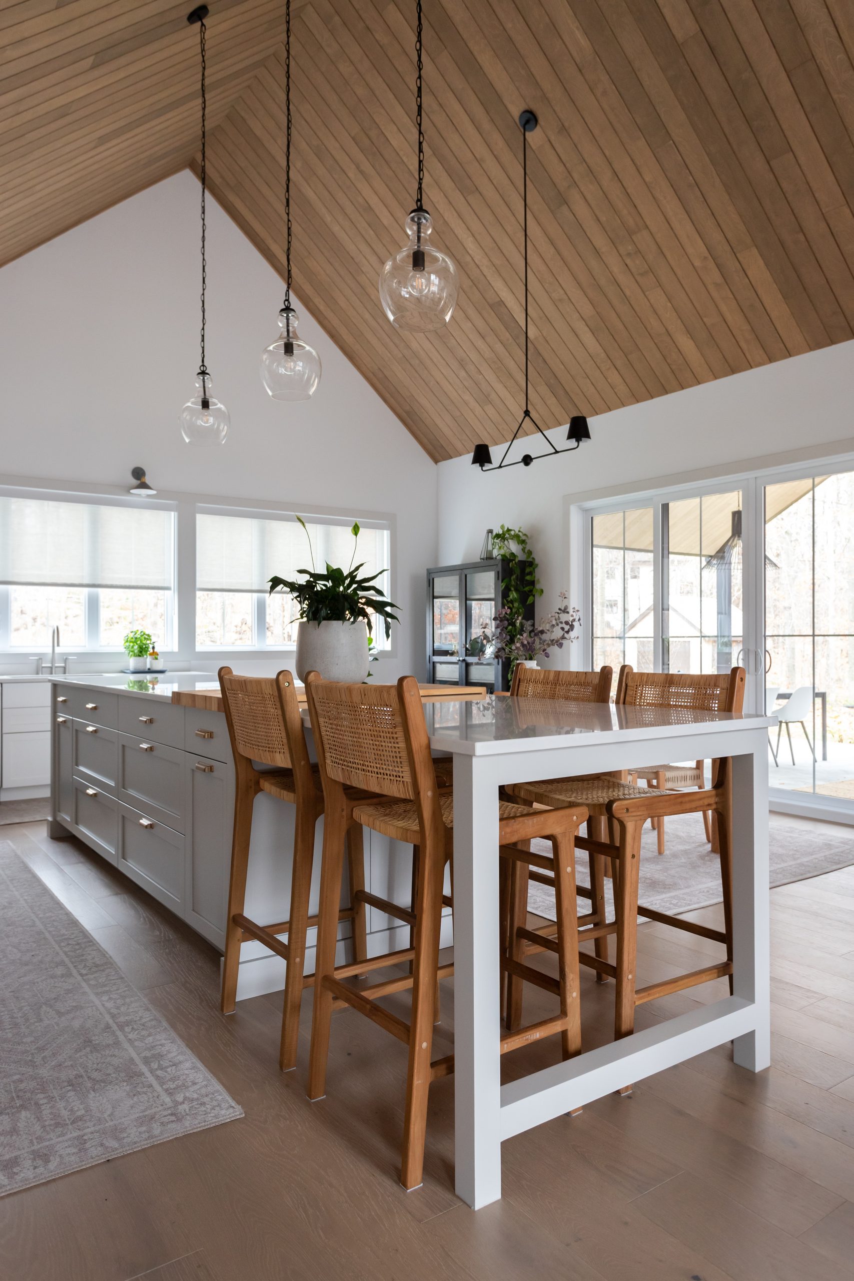Le plafond cathédrale en chêne réchauffe la palette claire de la cuisine. L’îlot et la table adjacente, disposés en enfilade, créent un espace convivial idéal pour les repas en famille ou entre amis.