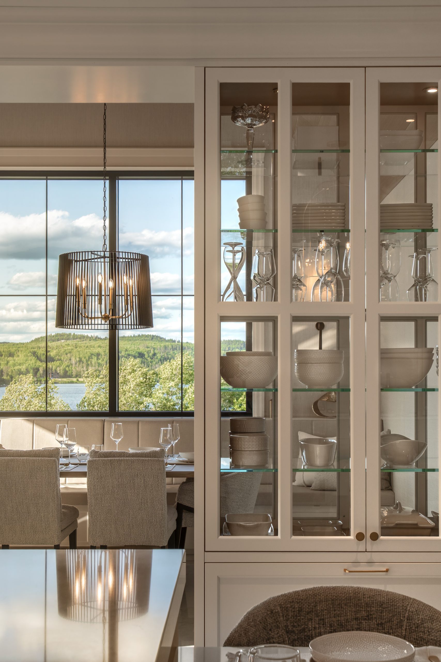 Les vaisseliers vitrés sur mesure marquent la transition vers la salle à manger et mettent la vaisselle en valeur. Un coin banquette convivial, installé sous la fenêtre, permet de profiter pleinement de la lumière et de la vue.