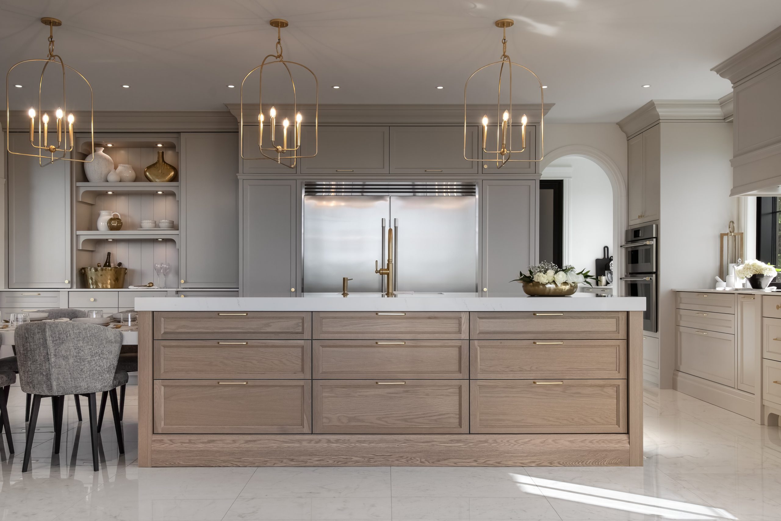 Long de 14 pieds, l’îlot en chêne blanc teint regroupe une surface de travail de 9 pieds, un évier sous plan, une table basse pour les repas de semaine ainsi que de nombreux tiroirs favorisant une organisation efficace. Accessible par l’arche, l’arrière-cuisine rassemble garde-manger, frigo secondaire et vaste comptoir.