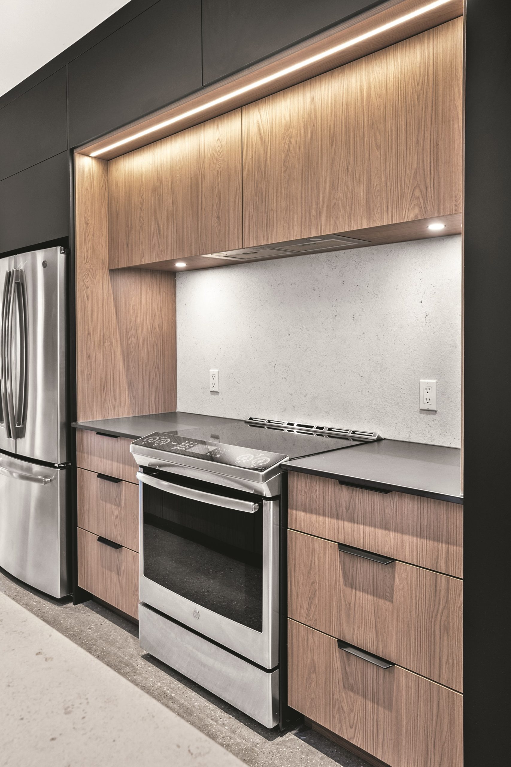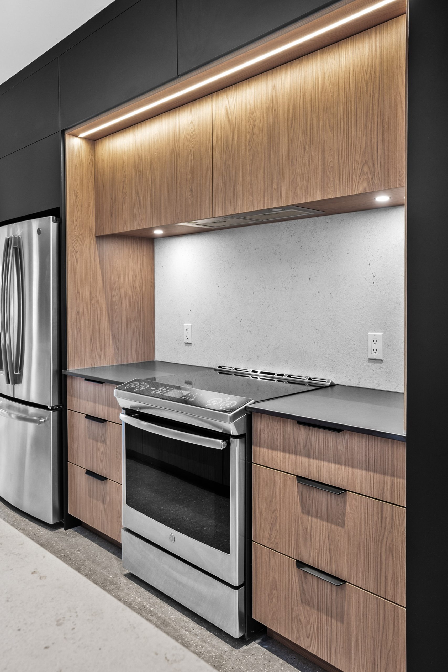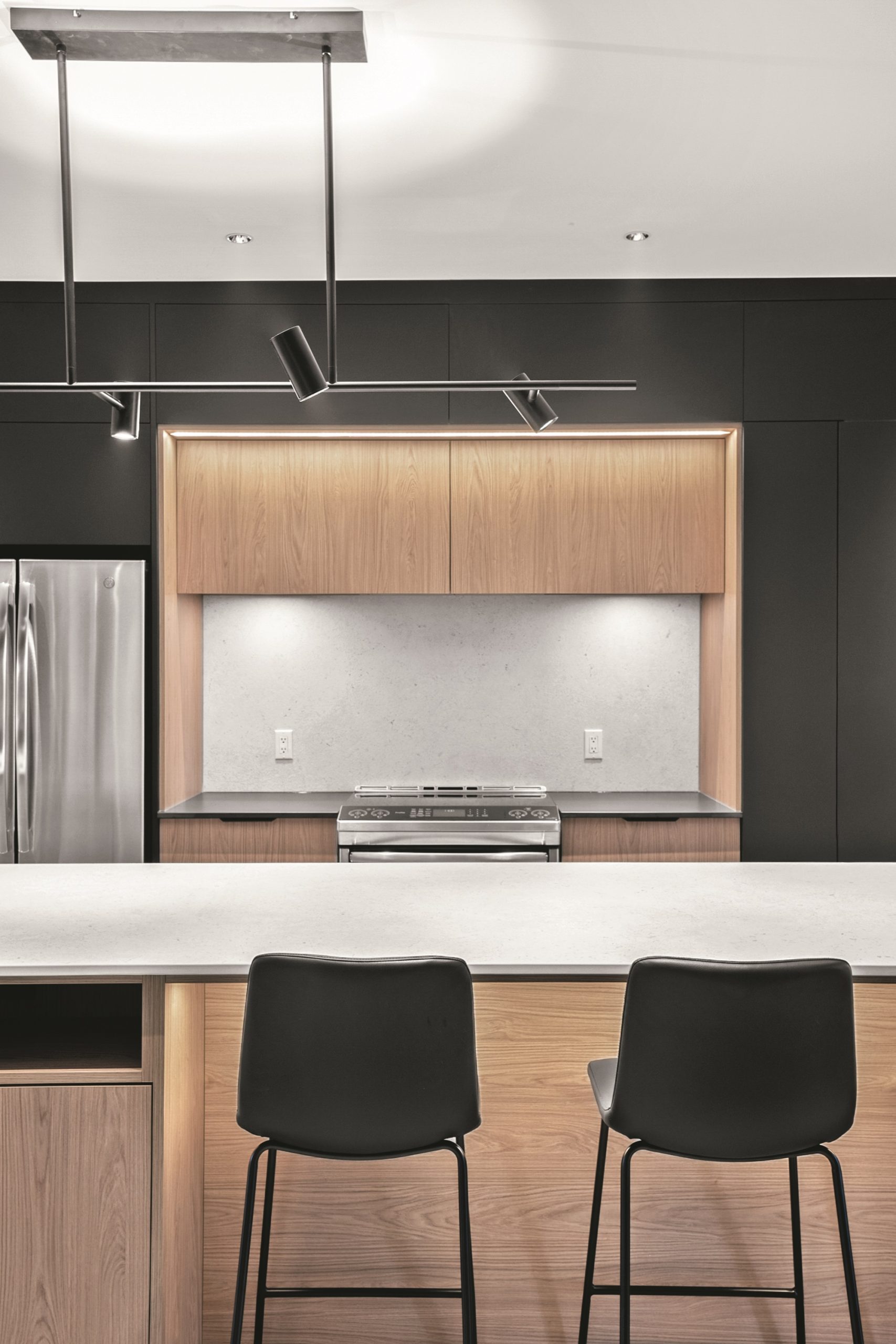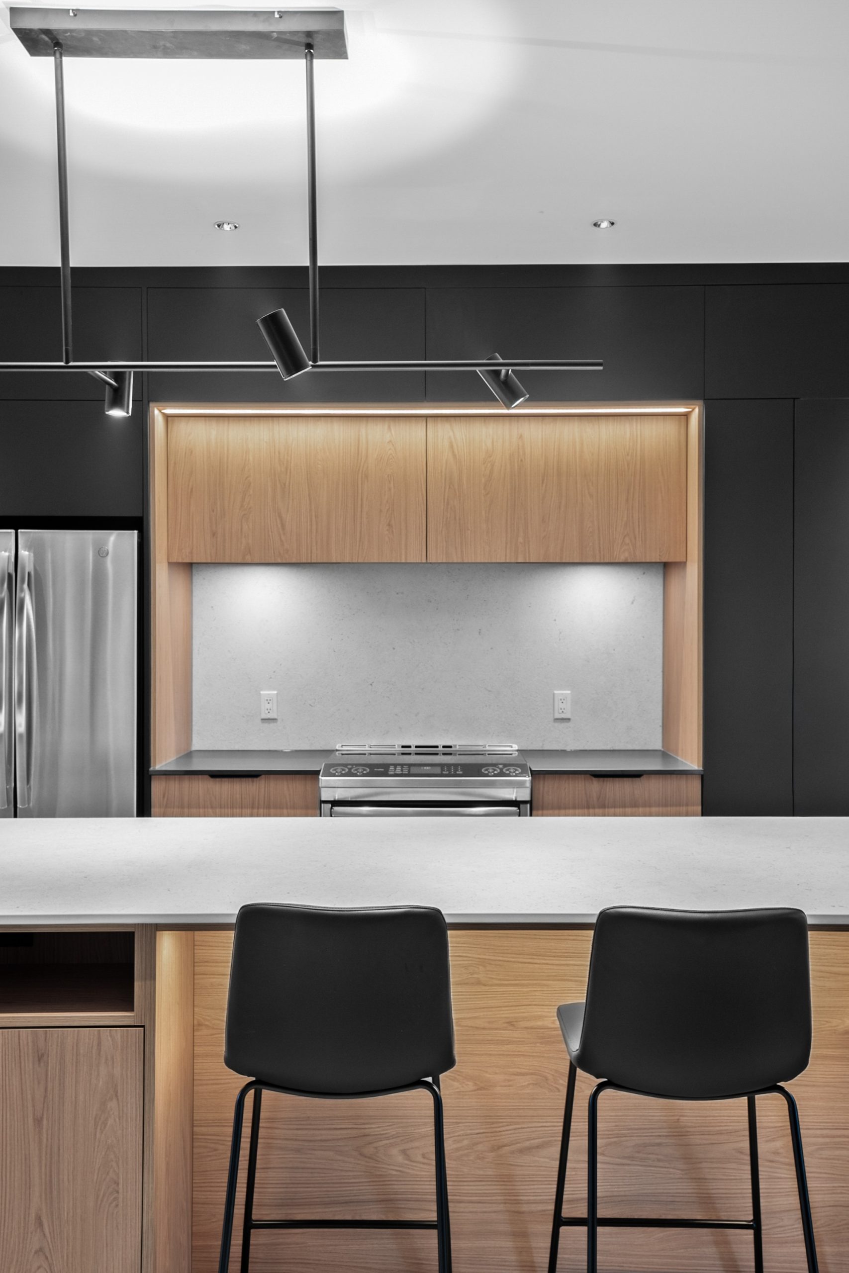 La zone de cuisson, intégrée dans une niche au cœur du mur d’armoires noires, se distingue par son dosseret en Dekton® assorti au plan de travail de l’îlot. Le module en laminé européen à effet bois, mis en valeur par un éclairage discret, ajoute une touche chaleureuse à l’ensemble.