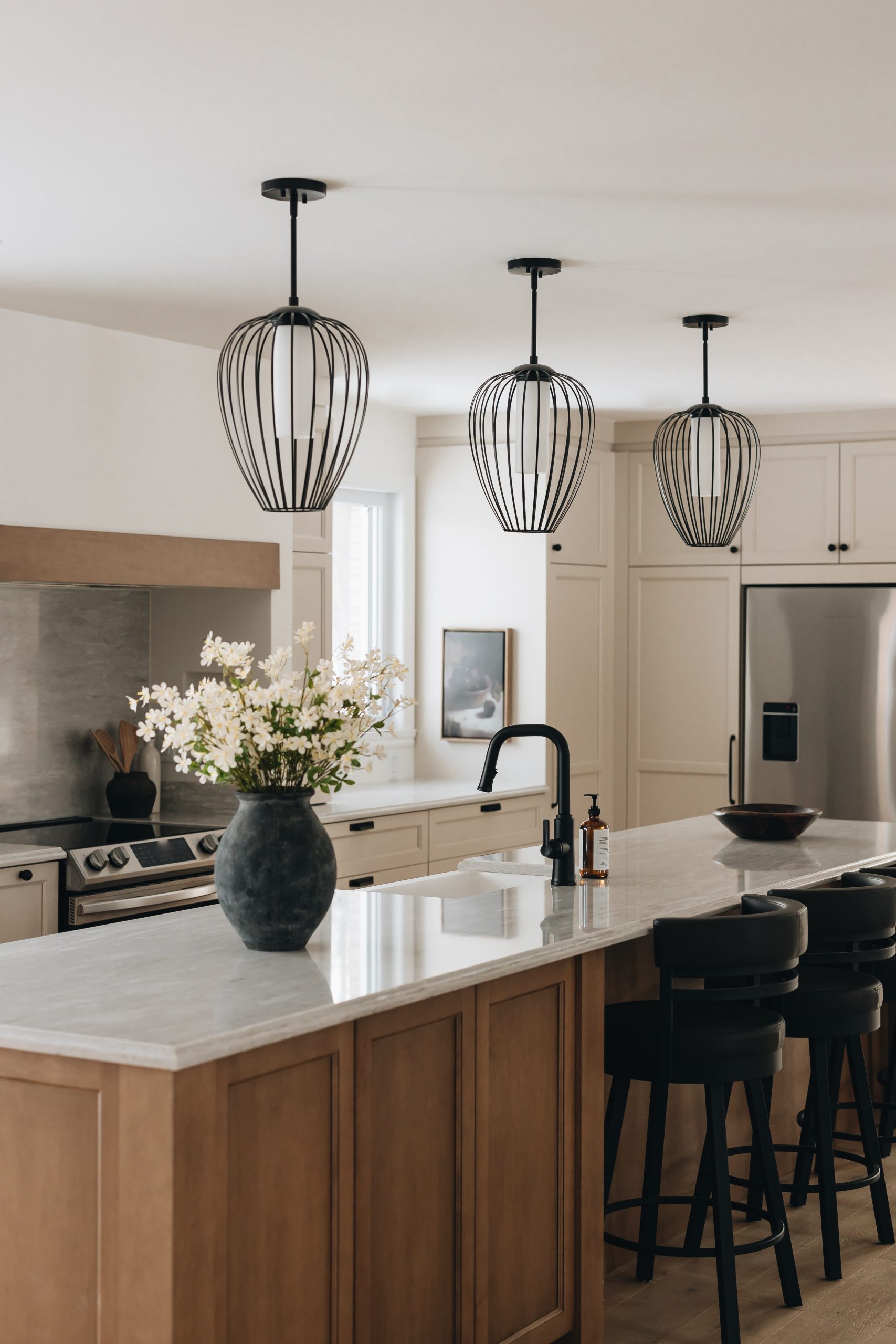 Au centre de la pièce, l’îlot crée un contraste chaleureux avec les armoires pâles. Le comptoir en quartz, avec son chant mouluré distinctif, se joint aux caissons de l’îlot pour ajouter une touche raffinée au décor.