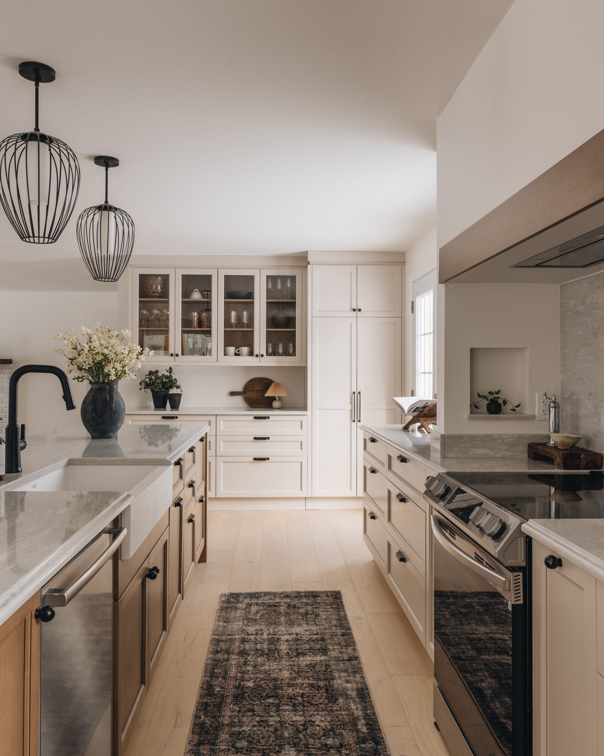 Bordé d’armoires pleine hauteur, le module vitré attire le regard et met en valeur des objets soigneusement choisis. La majestueuse hotte gainée de bois s’intègre harmonieusement à l’aménagement tout en ajoutant une belle dose de chaleur.