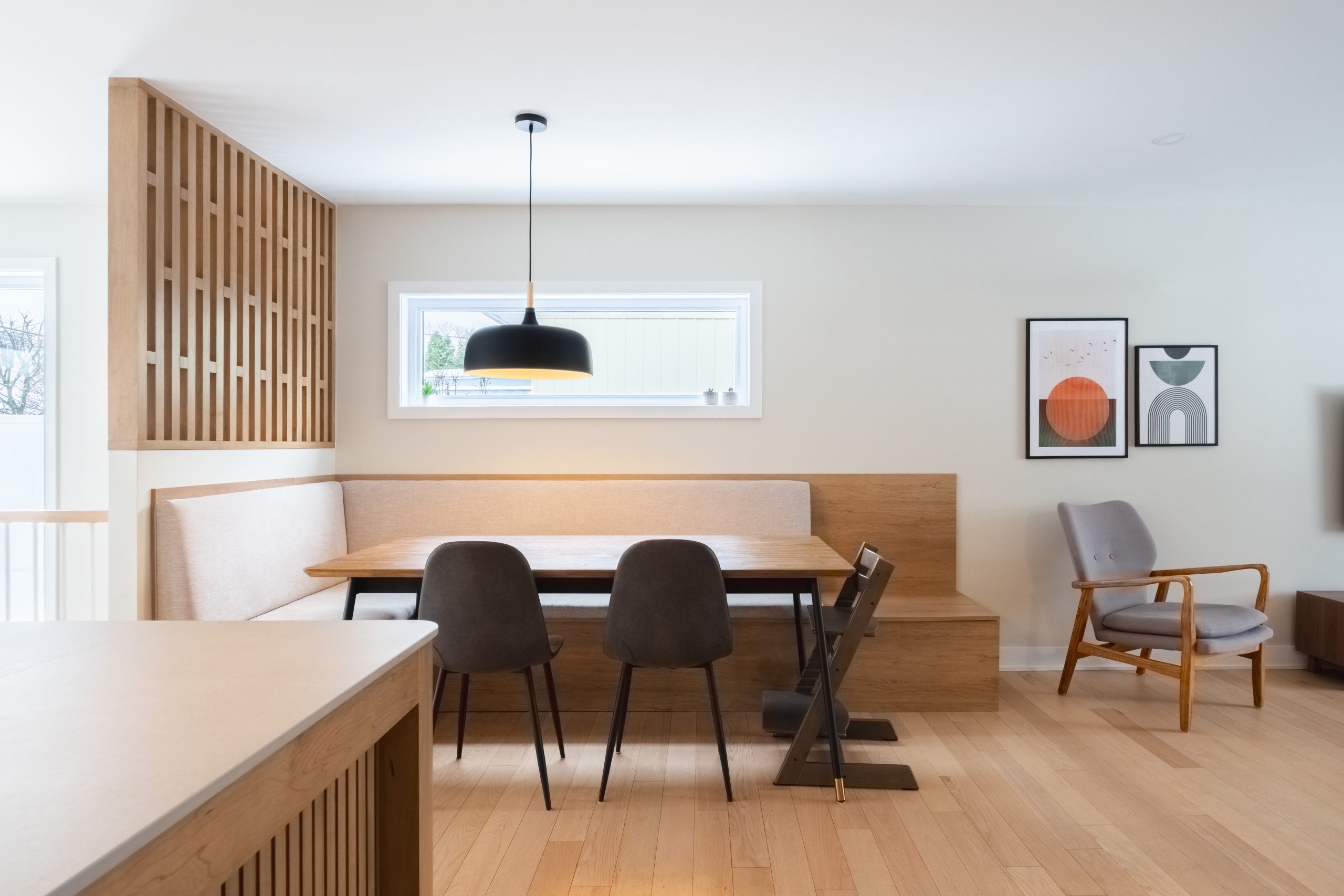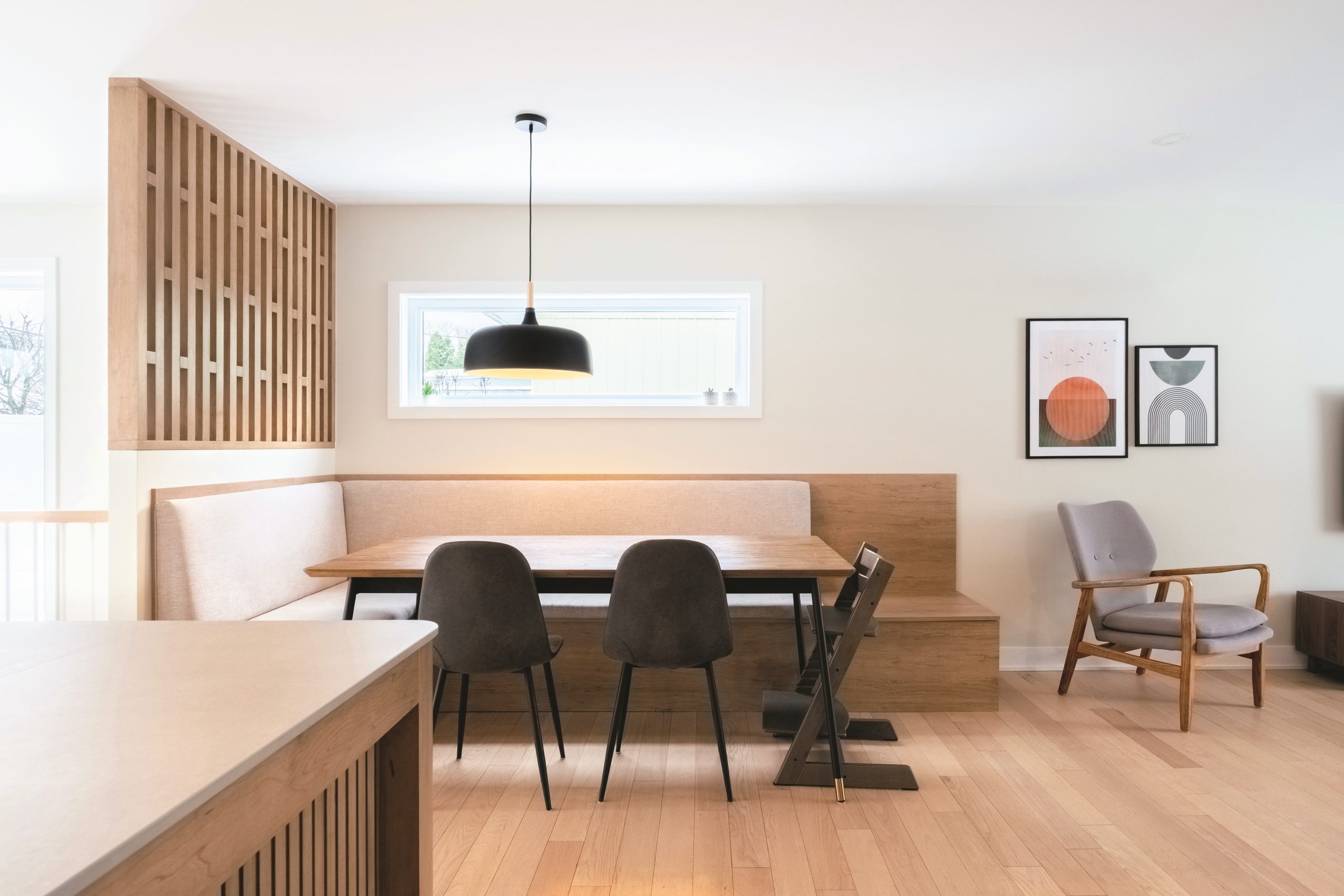 Grâce à la fenêtre en longueur et au claustra ajouré, le coin banquette bénéficie d’une belle luminosité.