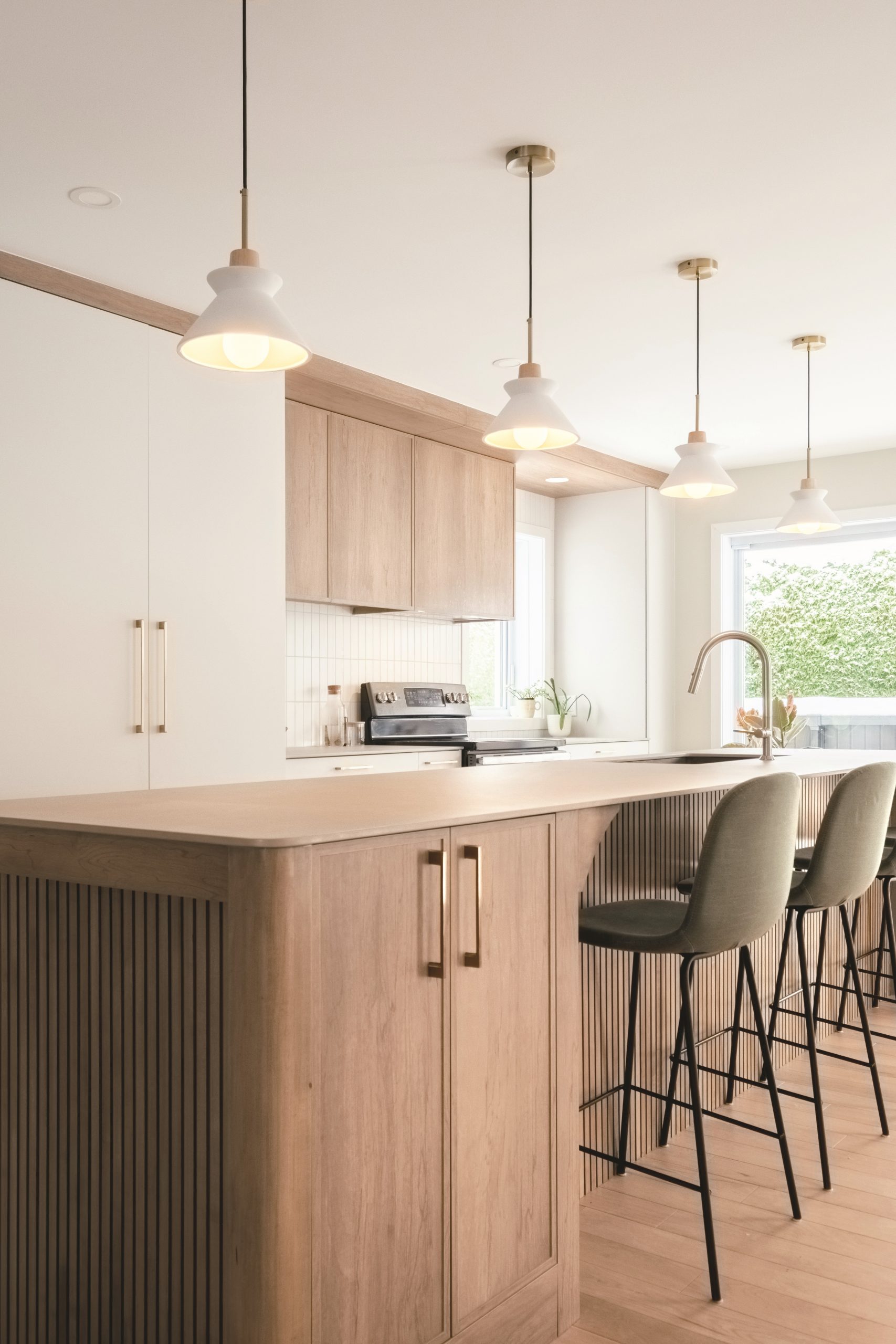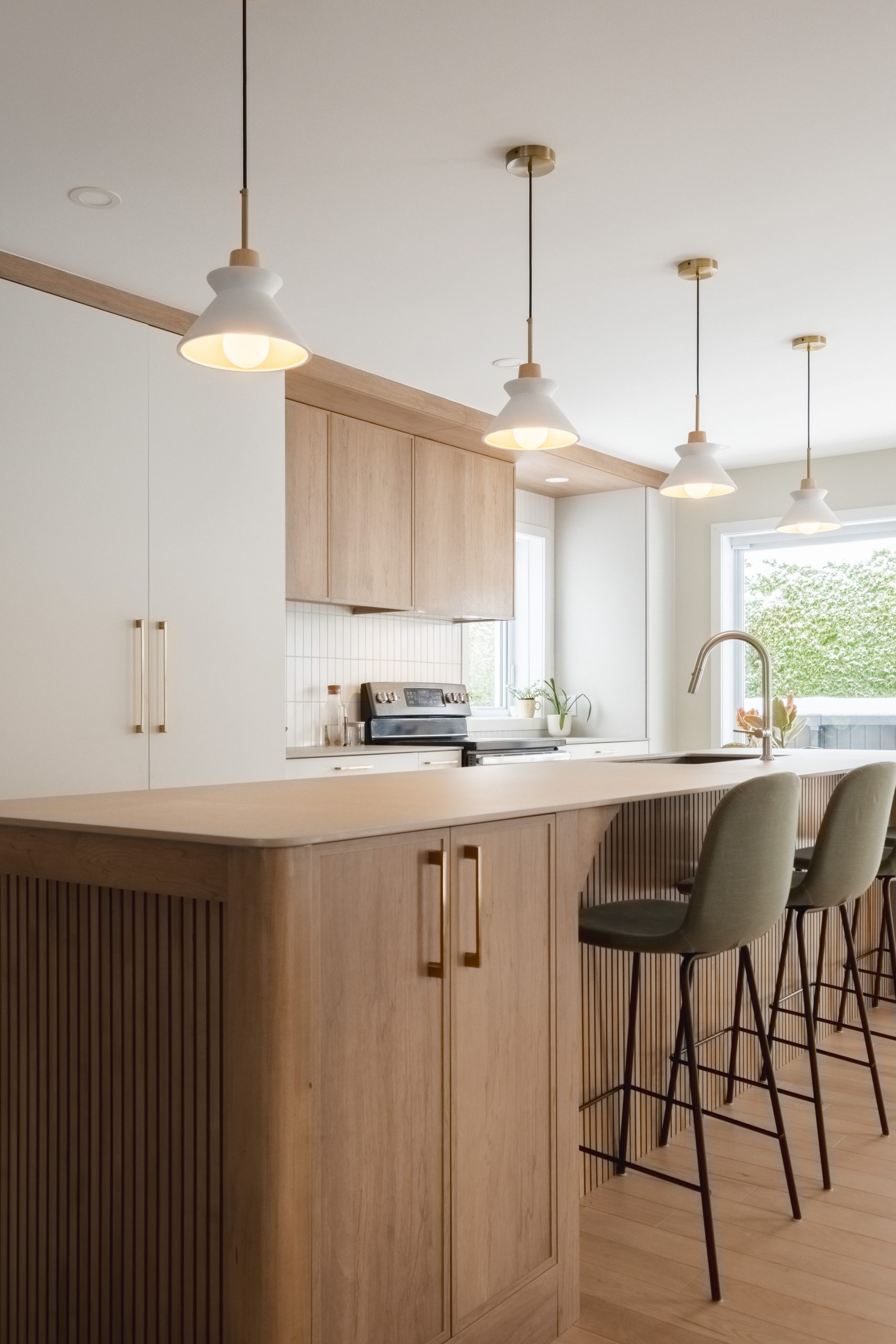 Avec ses courbes et ses insertions de lattes en érable teint, l’îlot affiche un style distinctif. Il offre une surface de travail généreuse, du rangement pratique et un coin-repas décontracté, au cœur d’un aménagement à la fois chaleureux et fonctionnel.