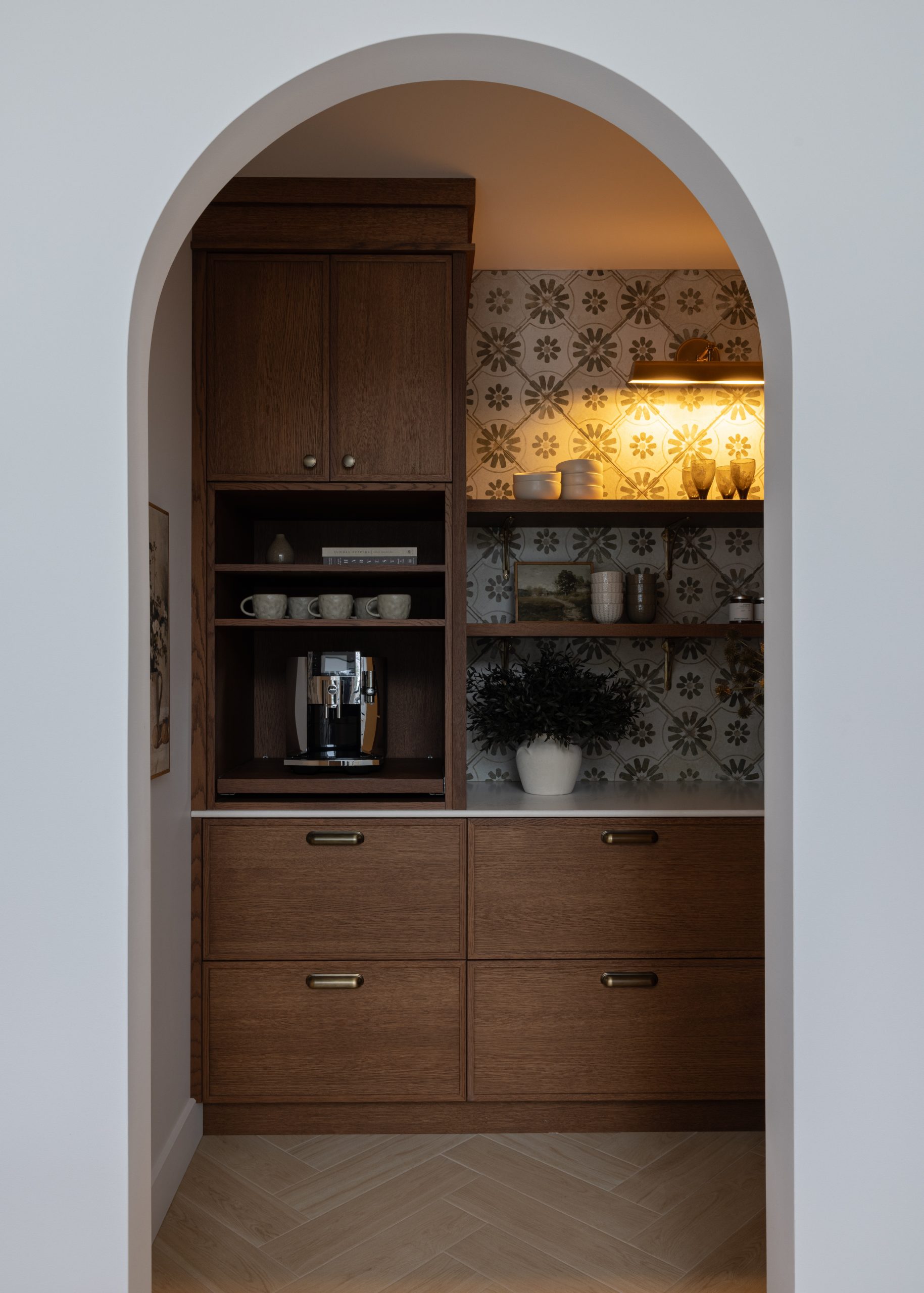 À travers une arche se dévoile le garde-manger walk-in, qui accueille notamment un coin café. Dans un souci de cohésion, on trouve les mêmes armoires en chêne blanc teint (couleur Java) que dans la cuisine. Les carreaux à motifs, inspirés de traditions artisanales d’ailleurs, ajoutent une touche de charme et d’évasion à ce petit espace soigneusement aménagé.