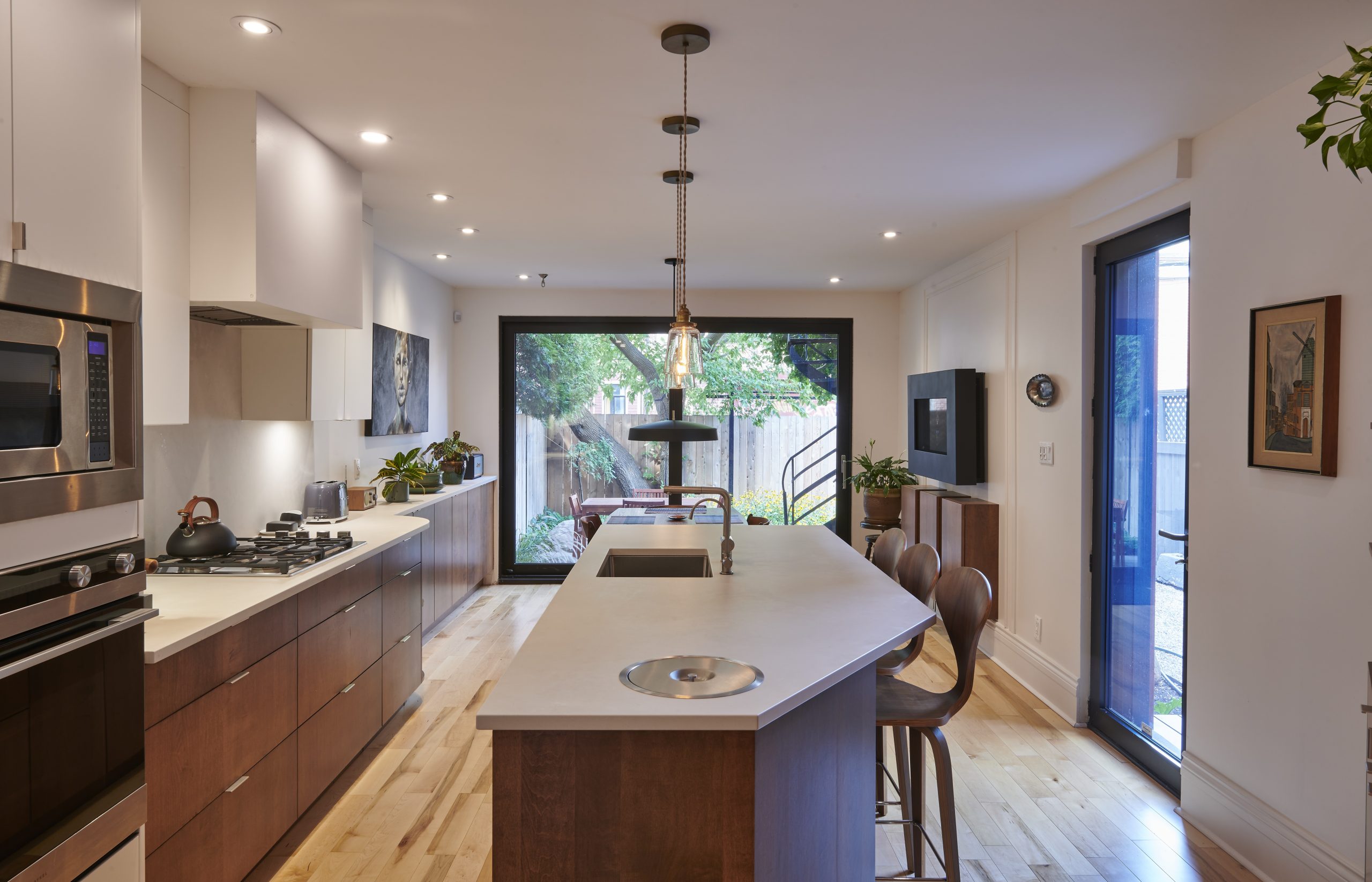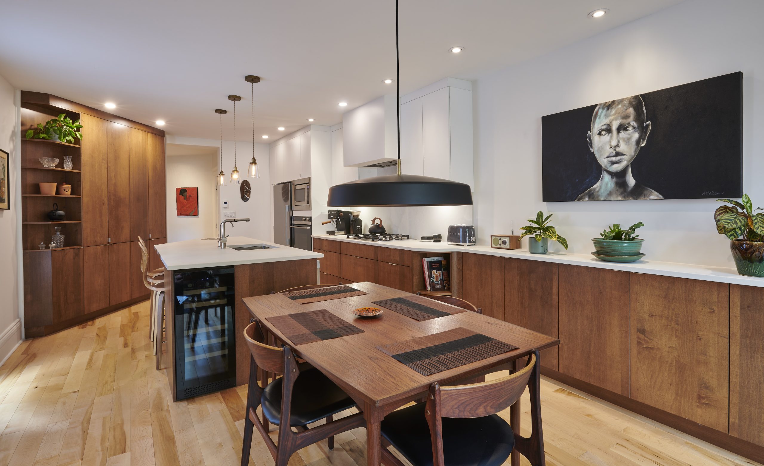 Rénovée pour répondre aux besoins d’une famille, cette cuisine marie les codes du style mid-century modern aux exigences actuelles en matière de confort et de fonctionnalité. Le bois d’érable teint des armoires inférieures apporte profondeur et chaleur, et les modules supérieurs, d’un blanc doux, allègent visuellement l’espace. Centre névralgique de la cuisine, l’îlot s’adapte à la routine quotidienne comme aux moments festifs.