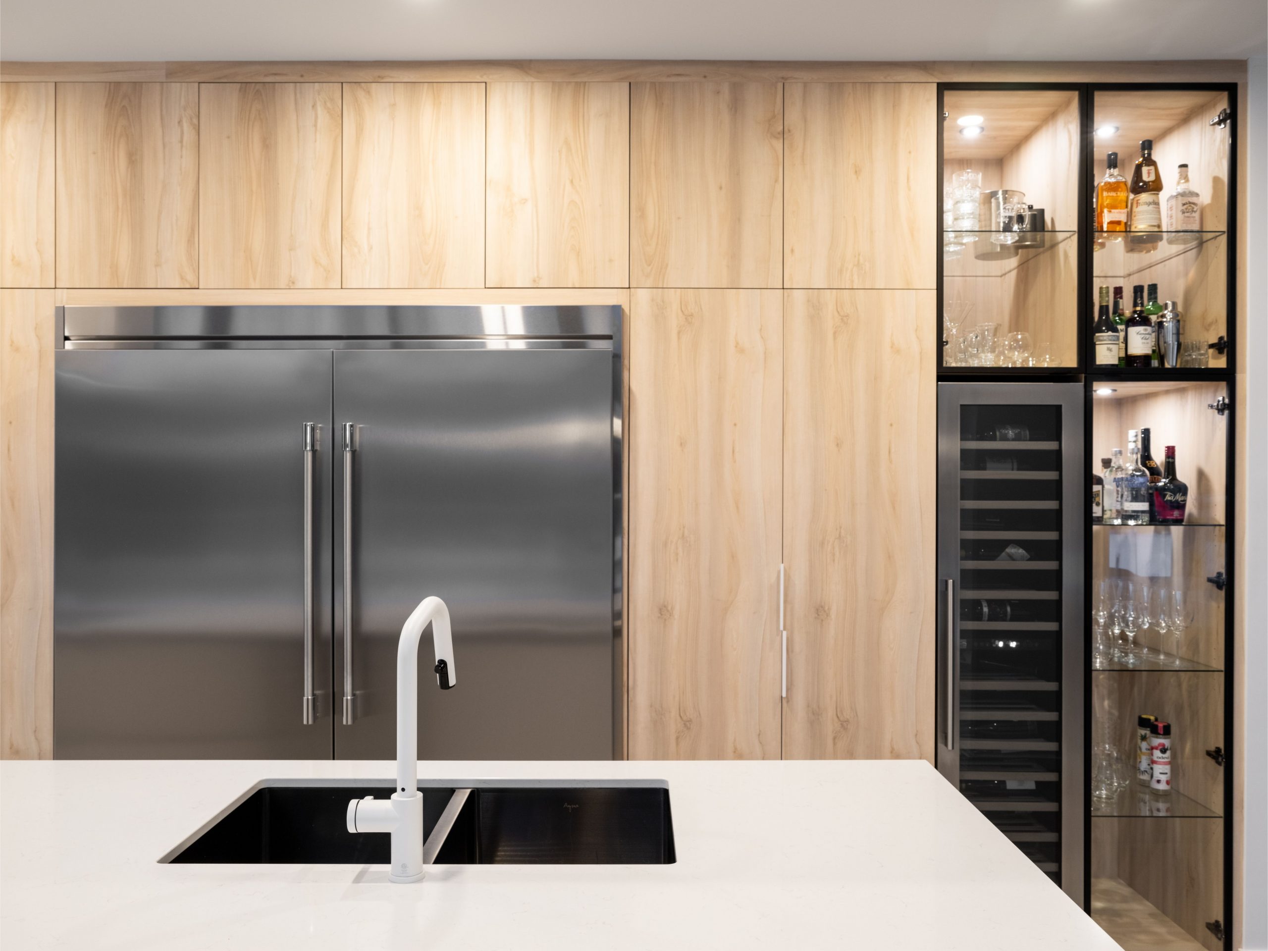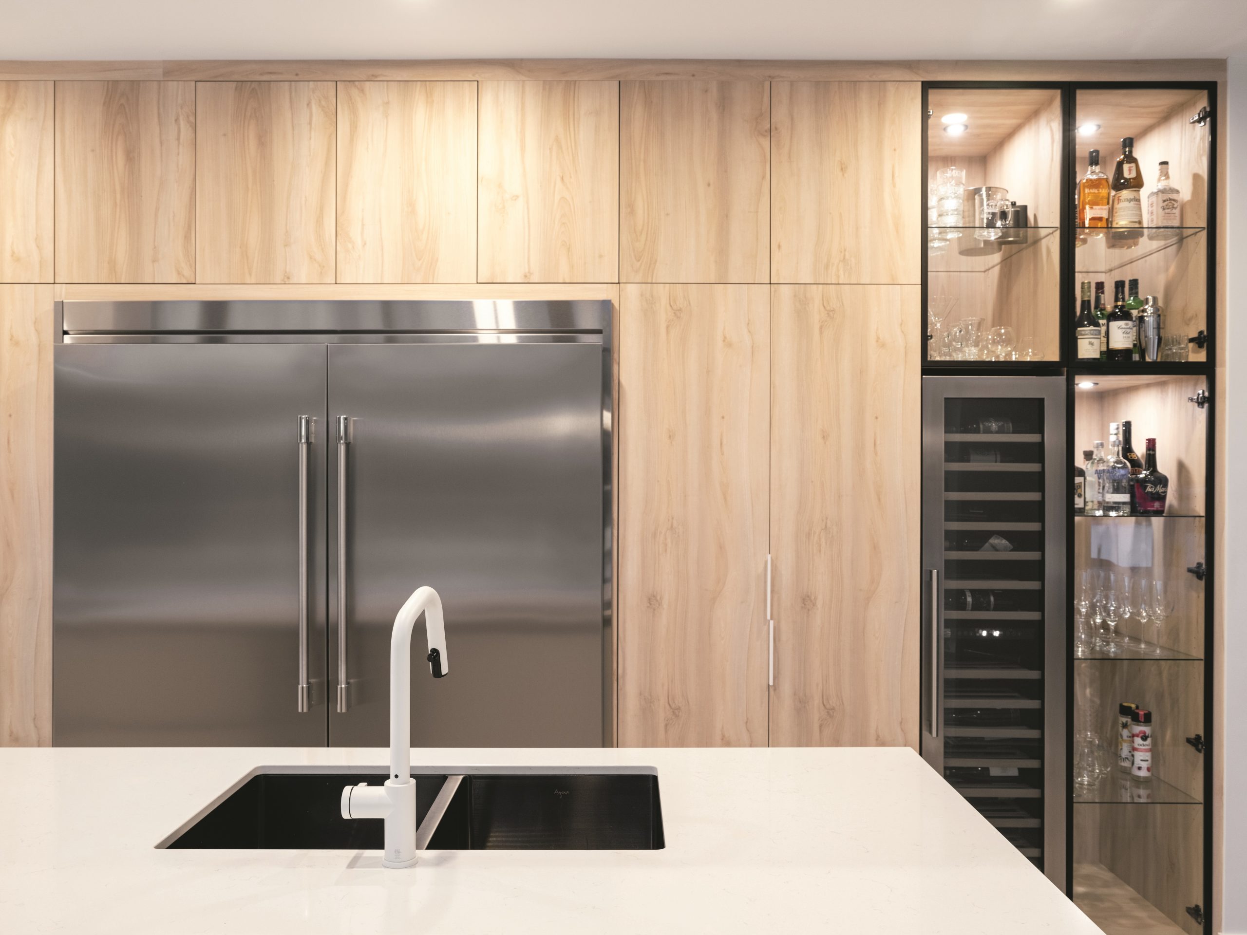 Four, réfrigérateur, cellier et armoire vitrée rétroéclairée s’intègrent harmonieusement au mur de rangement en mélamine à effet bois.