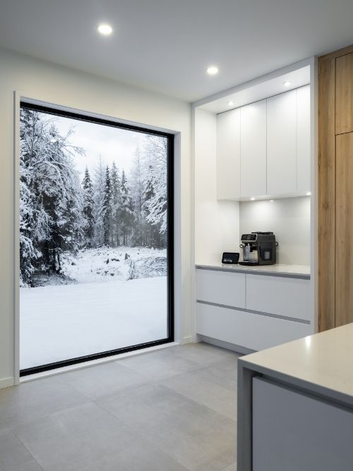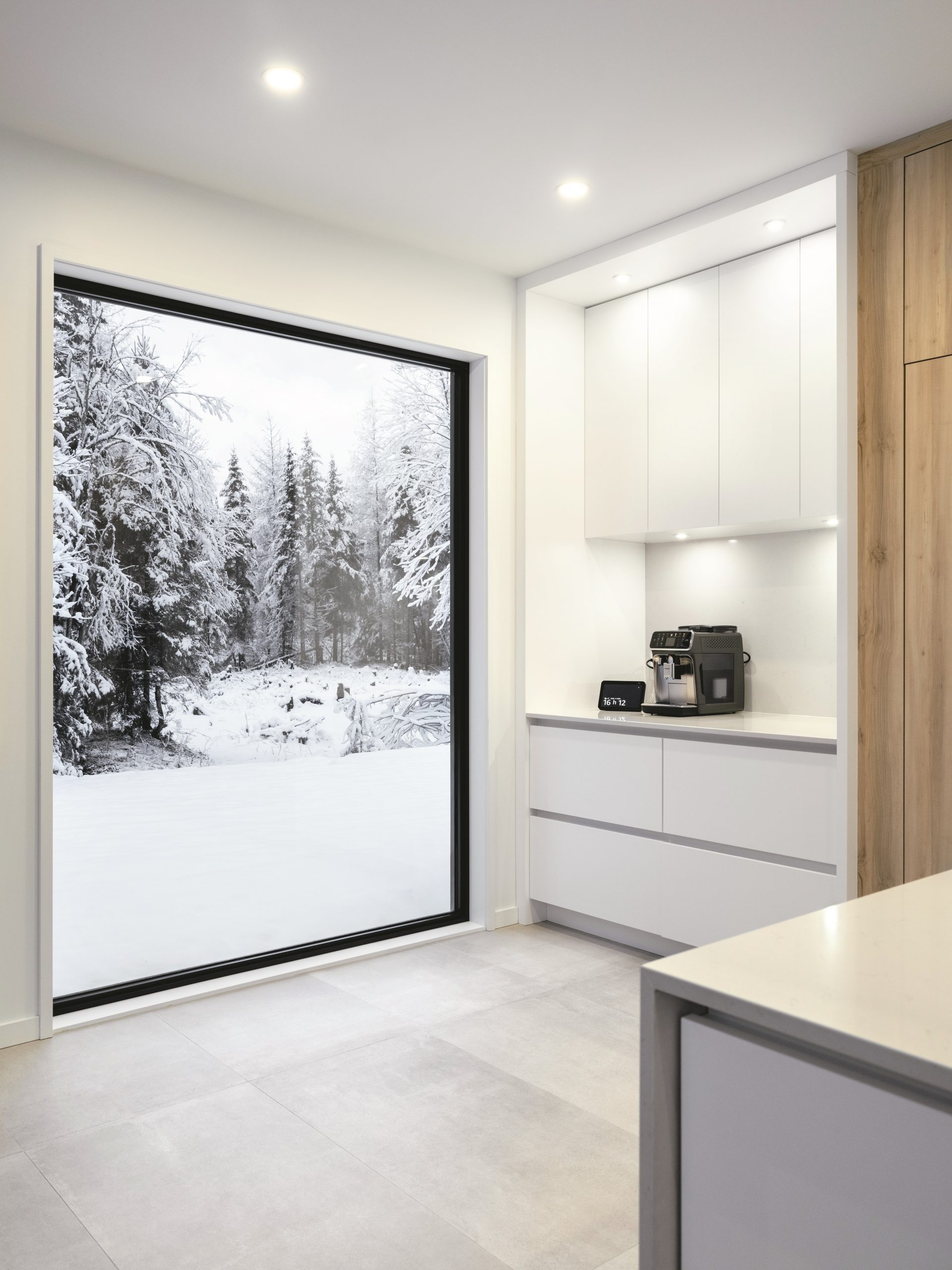 Discret et épuré, le coin café a été aménagé près de la fenêtre qui encadre la forêt, tel un tableau vivant qui évolue au gré des saisons. Une mise en scène simple et intemporelle, parfaitement en lien avec l’esthétique de la cuisine.