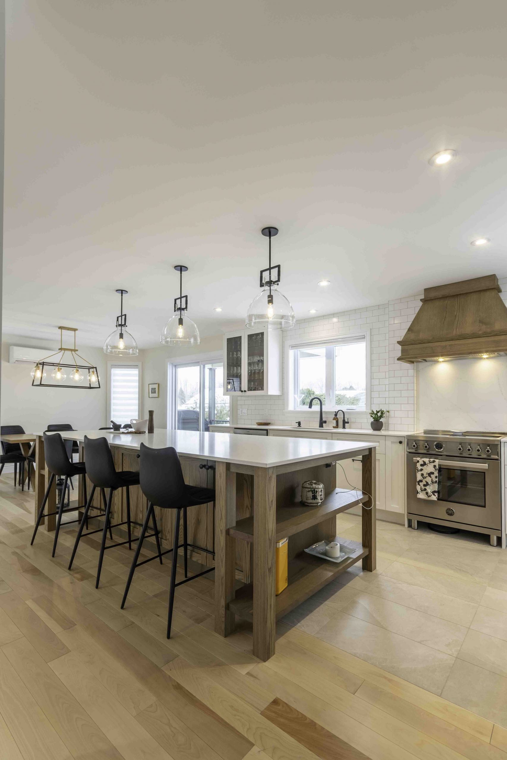 Dans cette cuisine rénovée, le style farmhouse s’exprime sobrement à travers des choix de matériaux à la fois simples et raffinés. Les armoires de style shaker en similaque couleur crème apportent une touche lumineuse et classique. Pour réchauffer l’ensemble, on a opté pour un îlot en laminé européen effet bois. Quelques éléments luxueux, dont un frigo XXL et un cellier, ajoutent de la praticité sans compromettre l’élégance du décor.