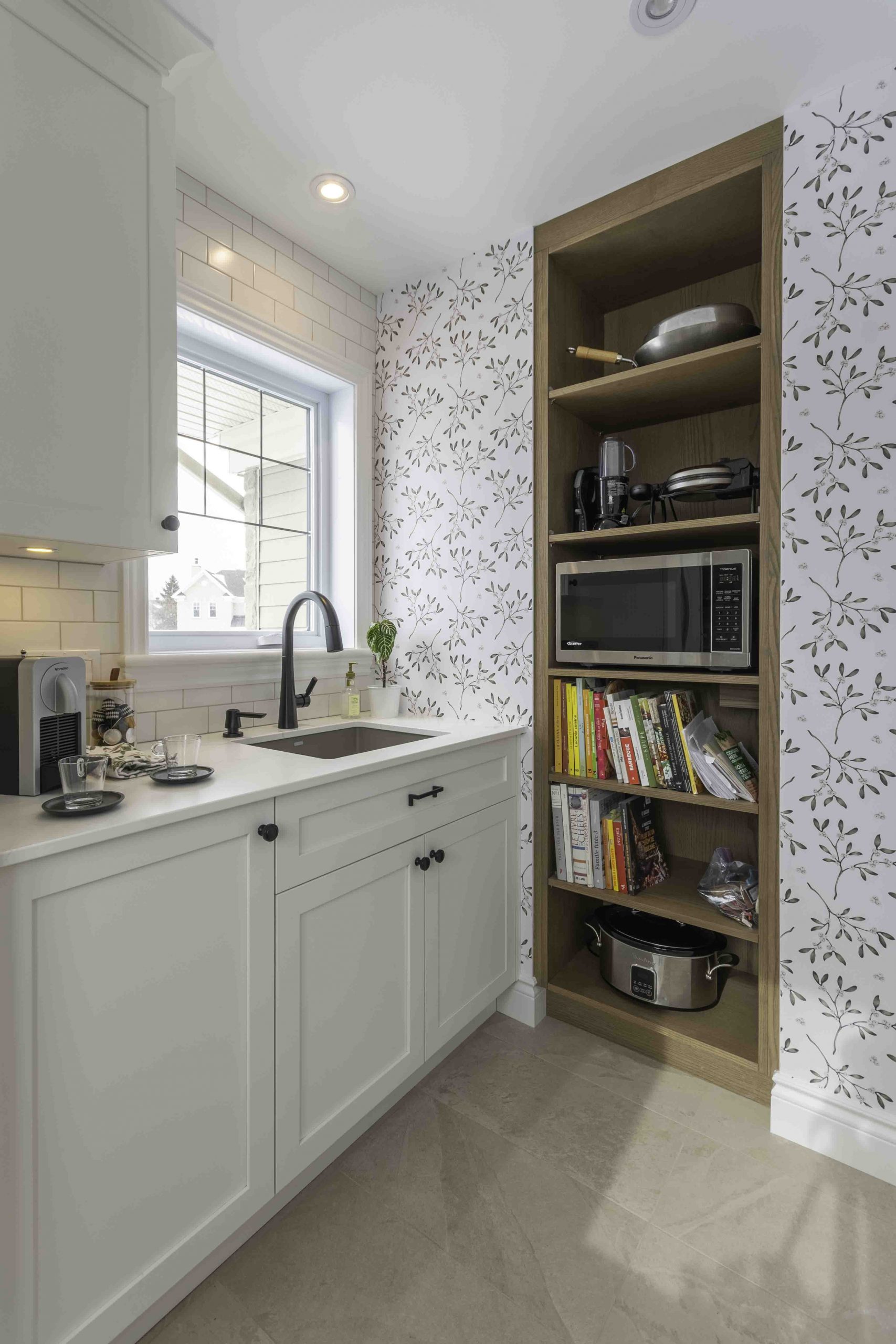 Aménagé en retrait de la cuisine, ce garde-manger walk-in combine plan de travail, évier, armoires et étagères ouvertes pour ranger livres, petits électros et denrées. Une fenêtre laisse entrer la lumière naturelle, et un papier peint au motif végétal appuie l’esprit campagnard de la cuisine.