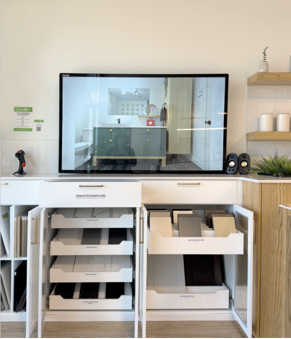 peut explorer à son rythme. Dans cet espace libre, les visiteurs découvrent une variété de styles, de matériaux et de finis. Grâce à un système de codes QR, il suffit de sélectionner ses